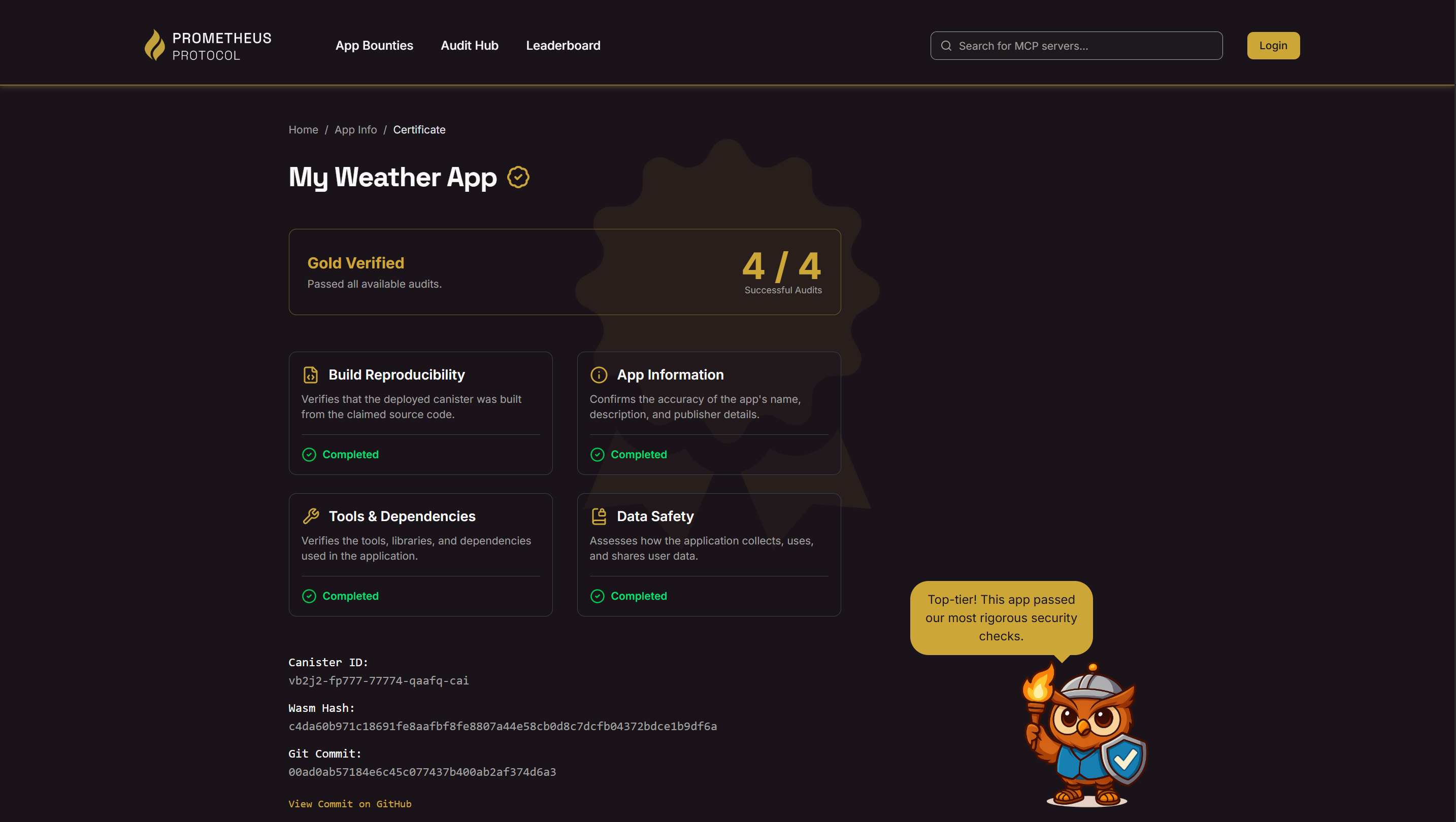After browsing the App Store and clicking on a service, you’ll land on its App Info page. The most important feature here is the Prometheus Certificate, which you can access by clicking the “view certificate” link under the verification badge. This certificate is the immutable, on-chain proof of the service’s quality and security.Anatomy of a Prometheus Certificate